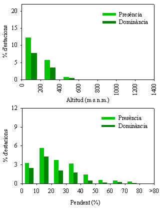 Figura 16. Percentatge d'estacions on l'espècie és present i on és dominant d'acord amb l'orografia. Cada percentatge s'ha calculat en relació amb el nombre total d'estacions mostrejades a la Regió Forestal III: 1.810. En aquesta regió el pi blanc és, com l’alzina, poc freqüent en orientacions entre el nord i l’oest. Però, a diferència d’aquella, se’l troba en pendents suaus i per sota dels 600 m d’altitud.